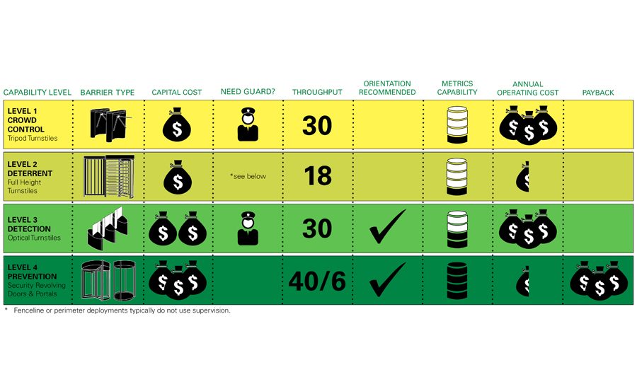 - Payback/ROI – The payback of full height turnstiles is solely as a perimeter deterrent. Ongoing capital costs are very low (maintenance and tune ups) relative to other Capability Levels because there is typically no direct guard supervision, or they are remotely monitored.