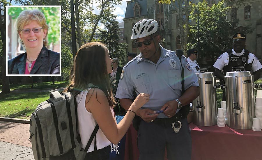University of Pennsylvania police and students came together October 3, 2018, for a “Coffee with a Cop” event on campus, part of a national effort to bring police officers together with the communities they serve to learn more about each other. Penn Public Safety uses events like these as an opportunity to “make an emotional deposit in the bank,” says Penn VP of Public Safety and Chief of Police Maureen Rush.