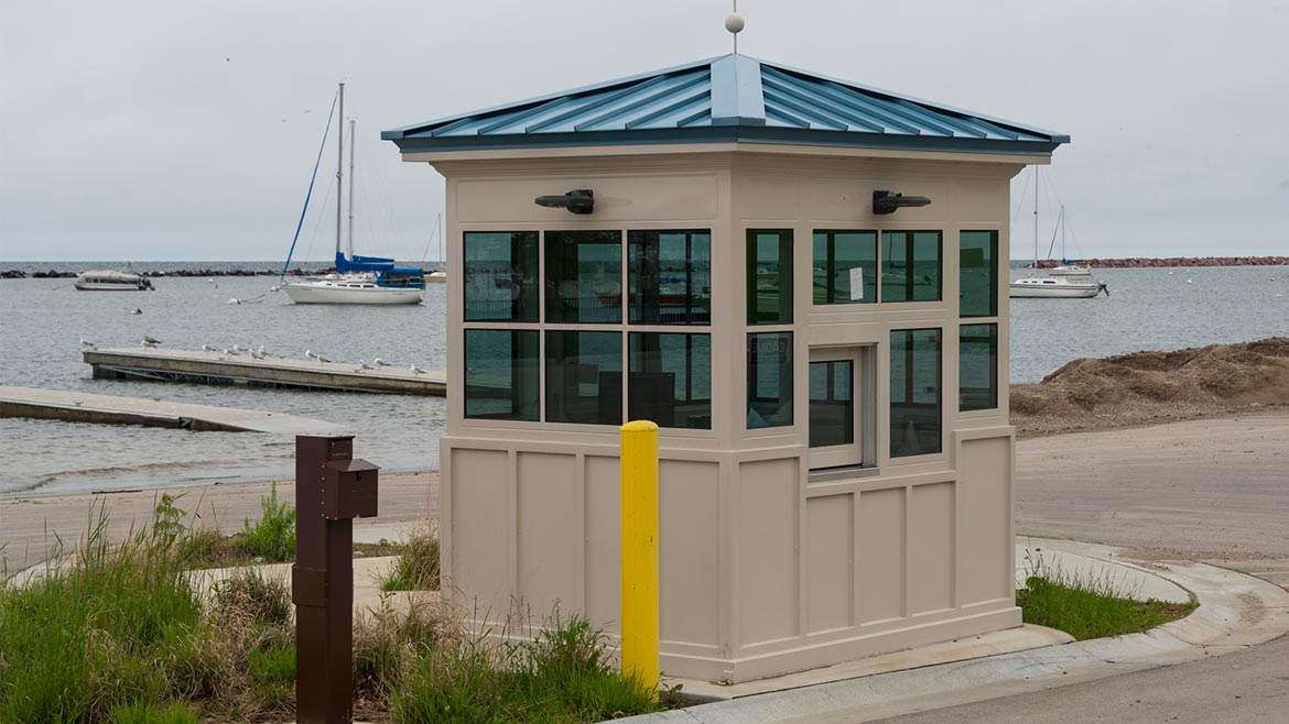 After a marina experienced repeated break-ins and theft, Par-Kut designed the 86PREZ-19192 security booth, a 6 by 8-foot structure with ballistic glass and a sliding communication window for the security officer to verify permissions to enter a facility. The booth has a standing-seam metal roof, decorative window mullions and wall treatment and exterior LED lighting. Heating and cooling were provided to ensure the insulated welded steel guardhouse would be a comfortable work environment during peak and shoulder seasons. Image courtesy of Par-Kut