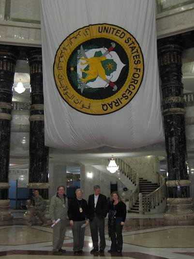 After our meetings concluded, we paused for a brief photo in the rotunda of the Palace, the full grandeur of which is currently cloaked by a huge banner hung from the ceiling, of the U.S. Forces—Iraq. As part of the evolving transition of the place the palace is soon slated for return to the people of Iraq.